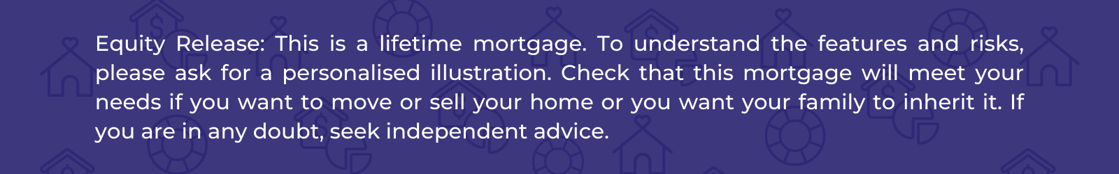 Equity Release: This is a lifetime mortgage. To understand the features and risks, please ask for a personalised illustration. Check that this mortgage will meet your needs if you want to move or sell your home or you want your family to inherit it. If you are in any doubt, seek independent advice.